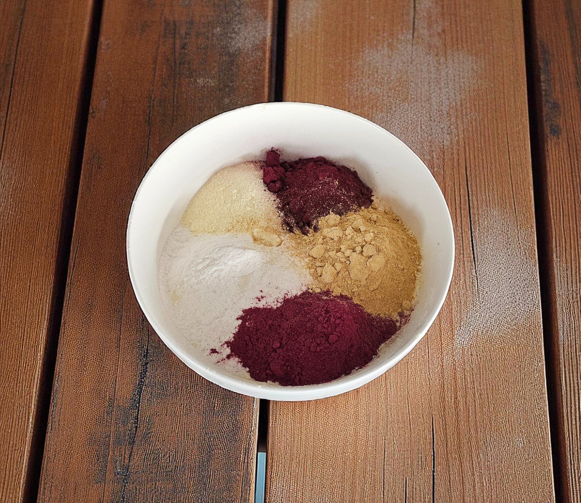ingredients: faba flour, rice flour, milk powder, hibiscus flowers, rose petals and lemon peel.