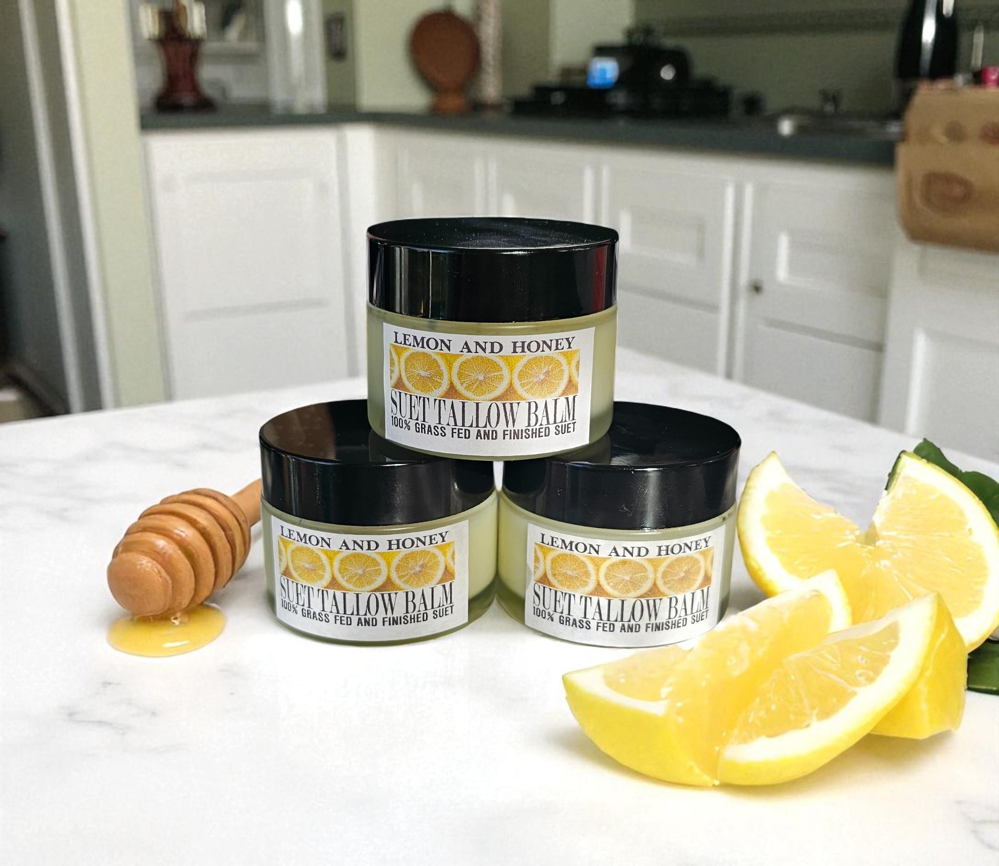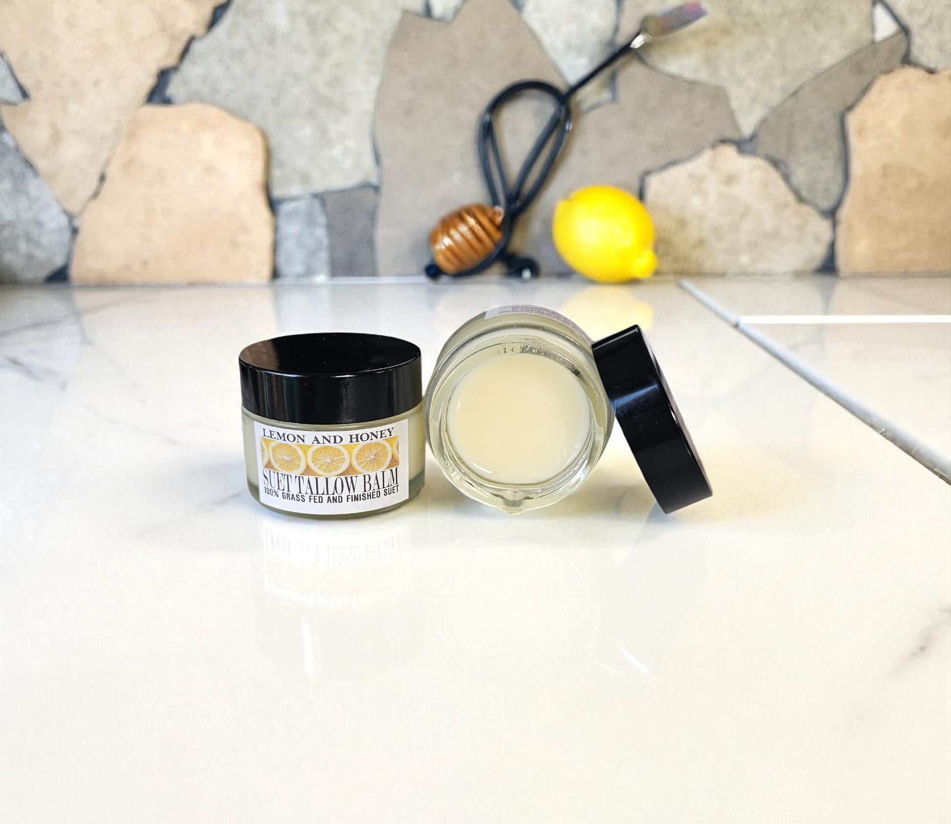 Brighten, nourish, and deeply hydrate your skin with our Lemon & Honey Suet Tallow Balm, a luxurious, nutrient-rich blend handcrafted to restore softness and radiance. Made with 100% grass-fed and finished suet tallow, sunflower oil, lemon juice, honey, vitamin E oil, and lemon essential oil, this balm melts effortlessly into the skin, providing long-lasting moisture and a healthy, luminous glow.