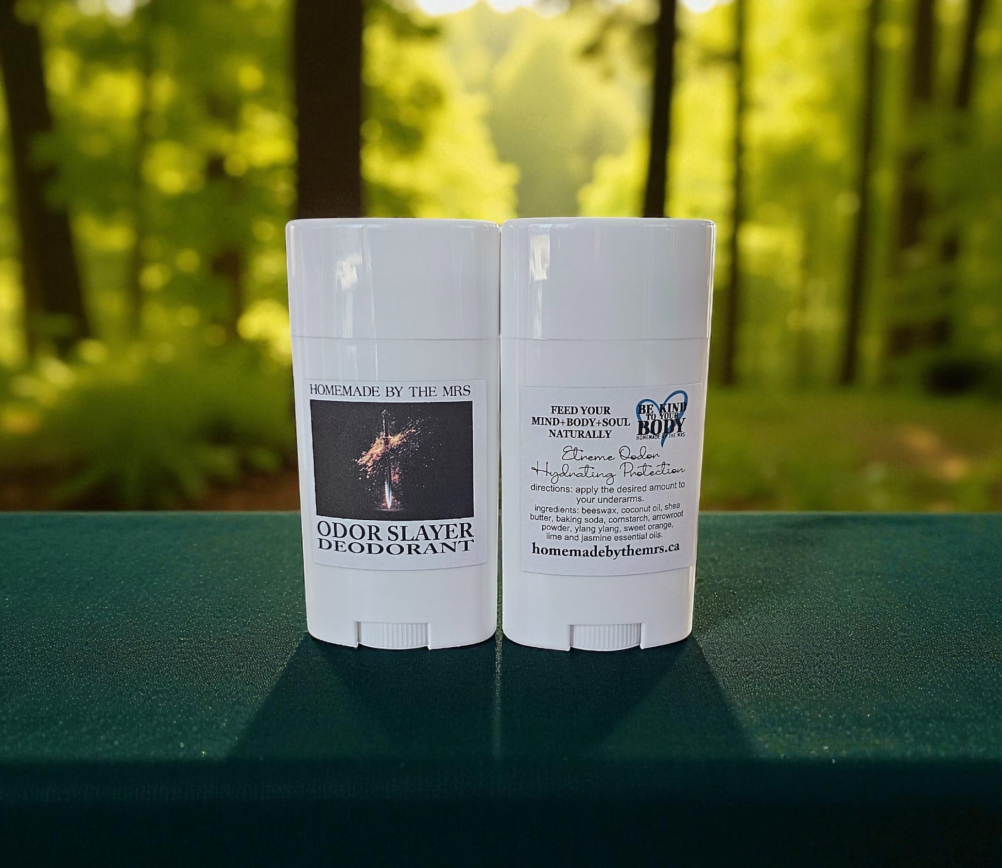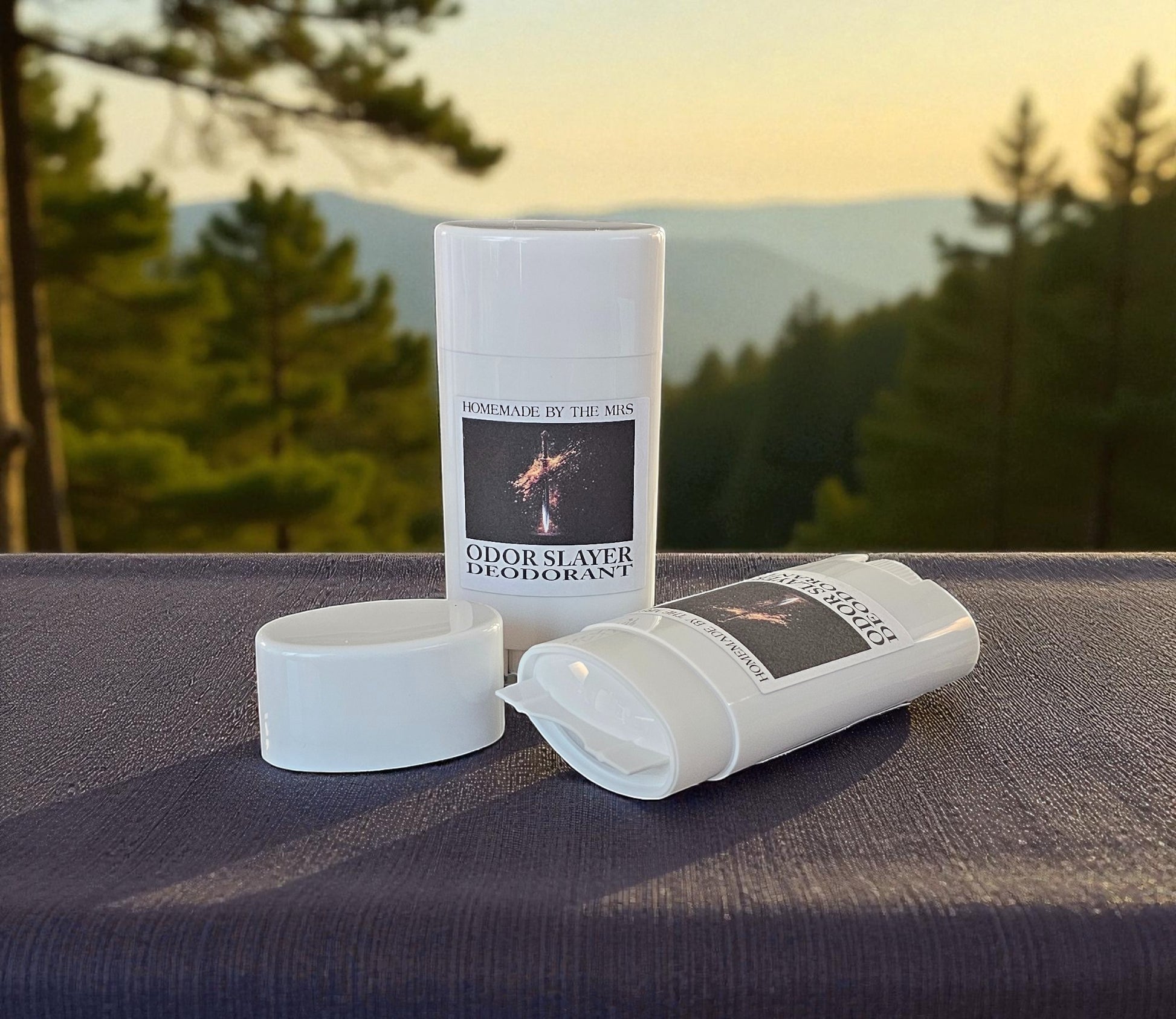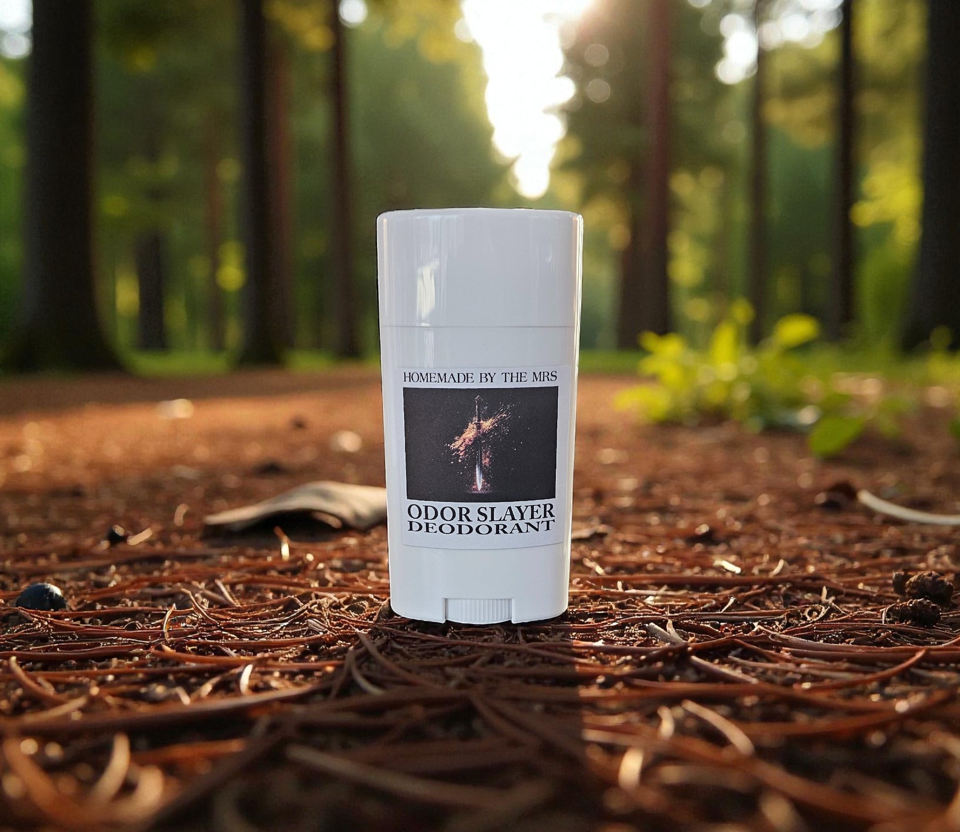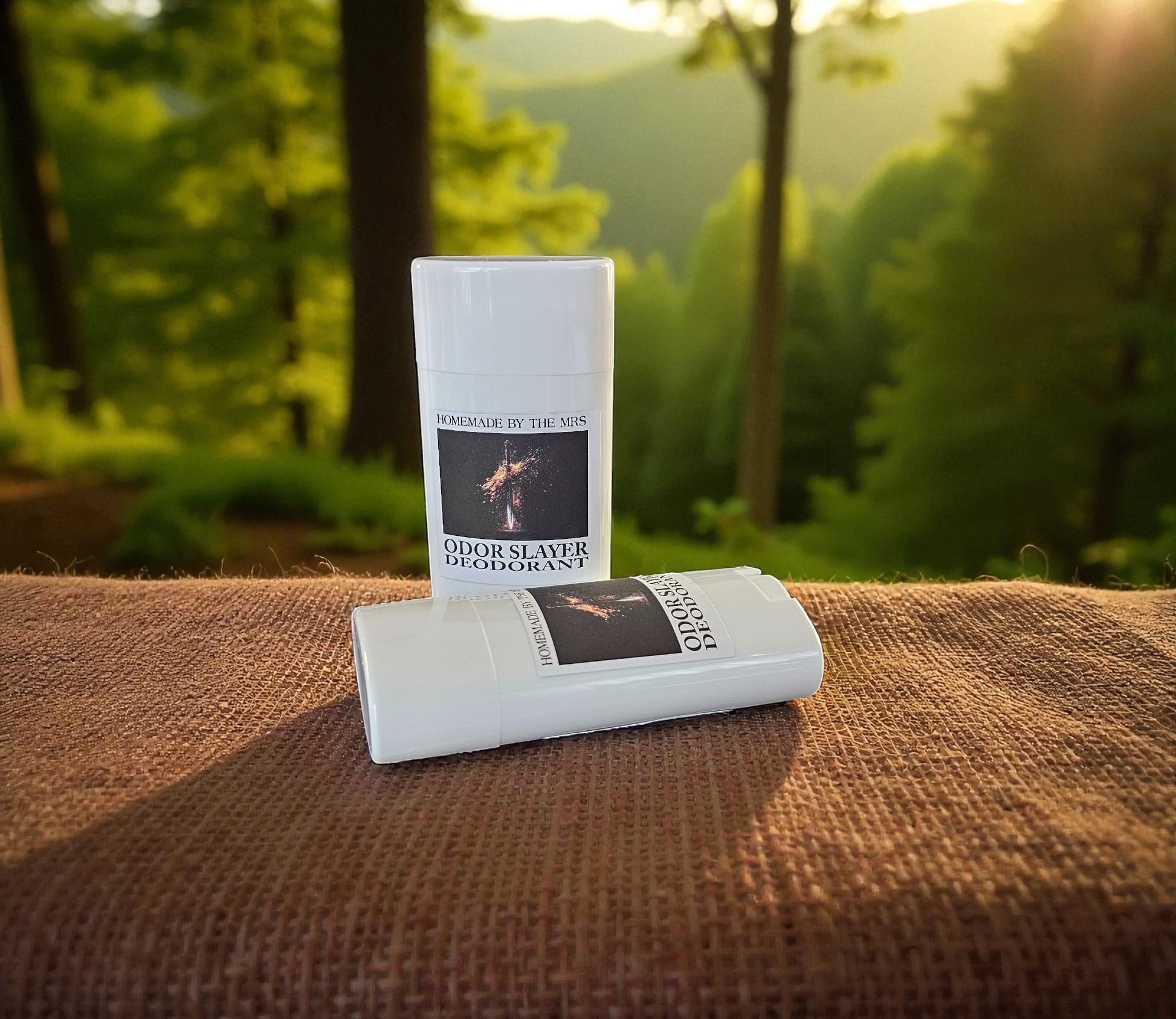 Stay confidently fresh all day with our Odor Slayer Deodorant — a powerful, all-natural deodorant handcrafted in small batches to combat stubborn odor naturally. This extra-strength formula is made with a skin-loving blend of beeswax, coconut oil, shea butter, baking soda, cornstarch, and arrowroot powder, giving you reliable, long-lasting odor protection without aluminum, parabens, or harsh chemicals.